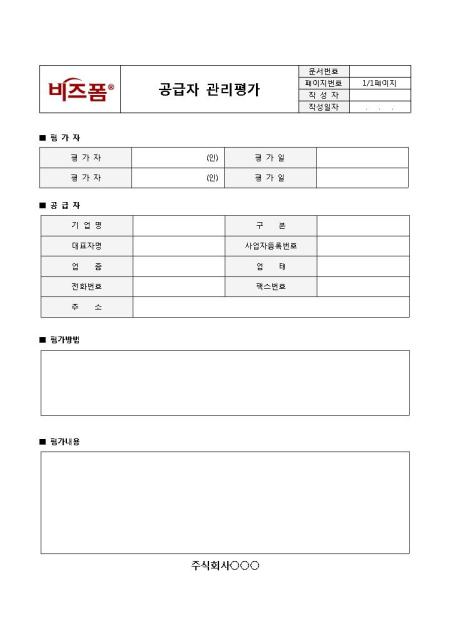 공급자 관리평가(간단양식)입니다. 공급자에 관하여 간단하게 관리 및 평가를 하고자 할 때 사용하는 문서로, 평가자 및 공급자의 정보를 입력할 수 있으며, 평가방법, 평가내용으로 구성되어 있습니다.