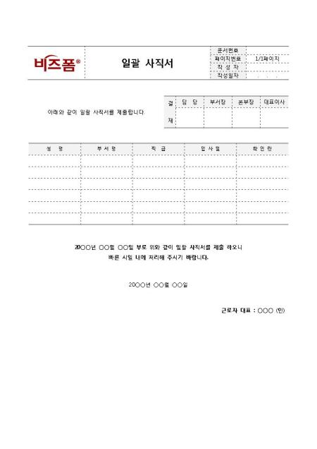 일괄 사직서(간단양식)입니다. 일괄적으로 사직서를 제출하고자 할 때 작성하는 문서로 성명, 부서명, 직급, 입사일 등으로 구성되어 있습니다.