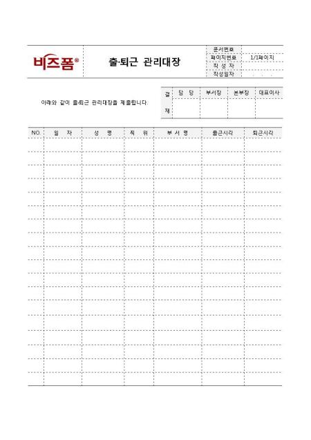 출퇴근관리대장입니다. 근로자의 출퇴근 관리를 위해 사용하는 문서로 일자, 성명, 출근시각, 퇴근시각 등으로 구성되어 있습니다.