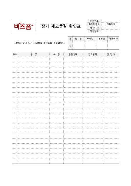 장기 재고품질 확인표입니다. 장기적으로 재고되어있는 품질을 확인할 때 작성하는 표입니다.
