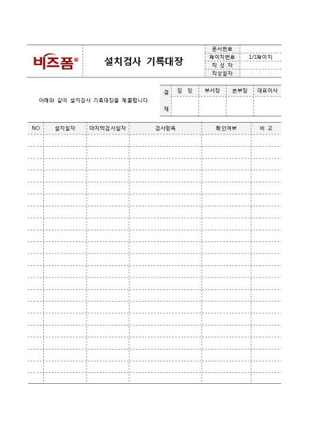 설치검사 기록대장입니다. 물품 등을 설치 후 관리유지를 위해 사용하는 문서로, 설치일자, 마지막 검사일자, 검사항목, 확인여부 등으로 구성되어 있습니다.