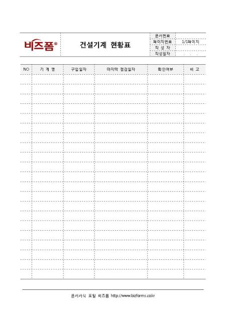 건설기계 현황표입니다. 건설기계 현황에 대하여 간단히 정리하고자 할 때 작성하는 표로 기계명, 구입일자, 마지막 점검일자 등으로 구성되어있습니다.