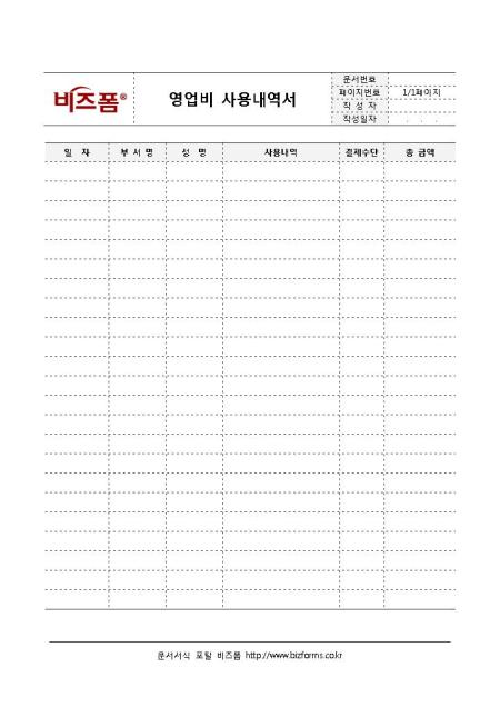 영업비 사용내역서입니다. 영업비 사용 내역에 대하여 작성하는 표로 일자, 부서명, 성명, 사용내역, 결제수단 등으로 구성되어 있습니다.