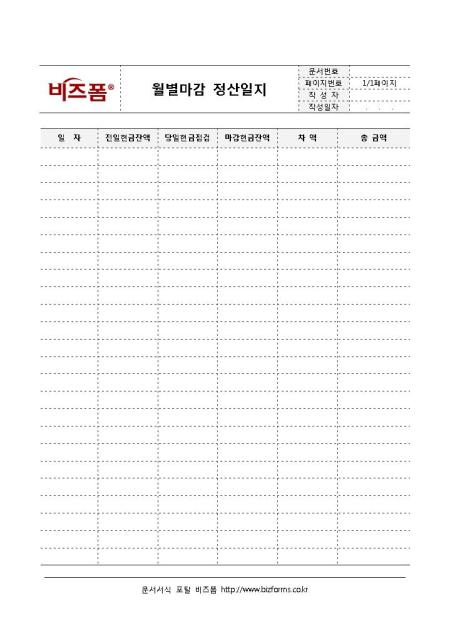 월별마감 정산일지입니다. 간단한게 정산에 관한 일지를 작성하는 표로 전일현금잔액, 당일현금점검, 마감현금잔액 등으로 구성되어 있습니다.