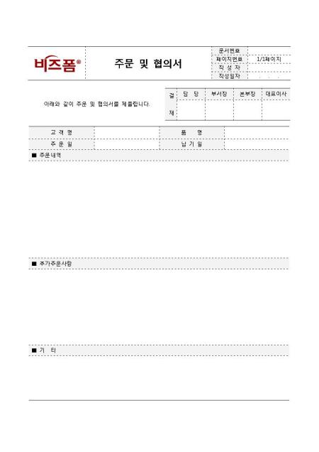 주문 및 협의서입니다. 거래처의 주문내역 및 협의내용을 작성 할 때 사용하는 문서로 고객명, 품명, 납기일, 주문내역 등으로 구성되어 있습니다.