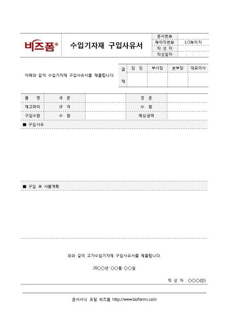 수입기자재 구입사유서입니다. 수입기자재를 구입하고자 할 때 작성하는 사유서로 품명(국문, 영문), 재고파악, 구입수량, 구입사유, 구입 후 사용계획 등으로 구성되어 있다.
