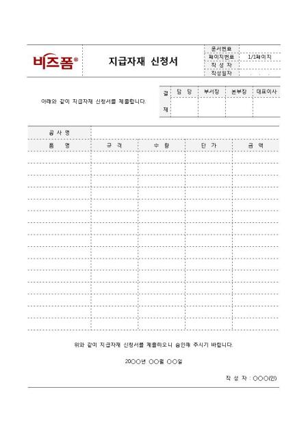 지급자재 신청서입니다. 자재신청할 때 작성하는 문서로 공사명, 품명, 규격, 수량, 단가 , 금액 등으로 구성되어 있습니다.