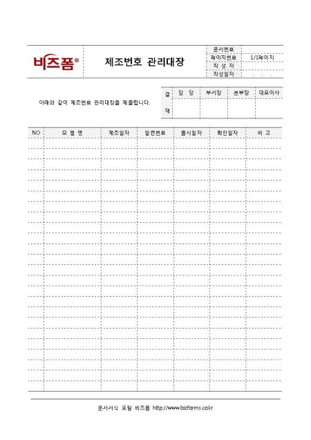 제조번호 관리대장입니다. 제조번호 관리 시 작성하는 문서로 모델명, 제조일자, 일련번호, 출시일자, 확인일자 등으로 구성되어 있습니다.