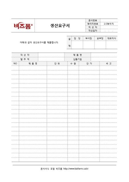 생산요구서(기본양식)입니다. 제품명, 발주처, 납품기일, 제품명, 단위, 수량, 단가 등으로 구성되어 있습니다.