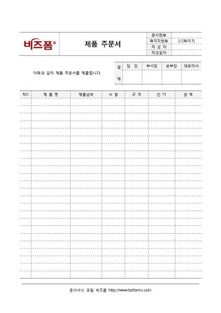 제품 주문서입니다. 제품 주문 시 작성하는 문서로 제품명, 제품넘버, 수량, 규격, 단가, 금액 등으로 구성되어 있습니다.