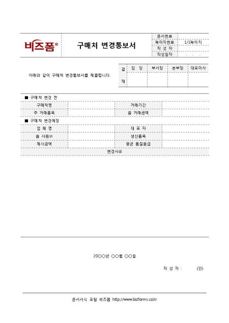 구매처 변경통보서입니다. 구매처를 변경하고자 할 때 작성하는 문서로 변경 전의 구매처 정보 및 변경예정인 거래처의 정보를 입력할 수 있습니다.