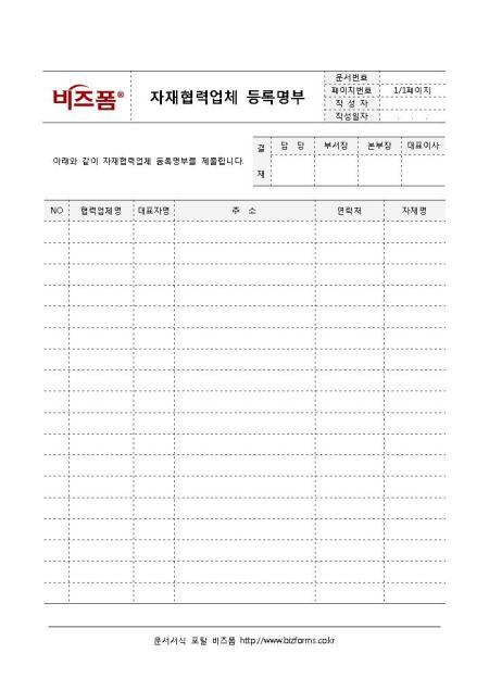자재협력업체 등록명부입니다. 협력업체명, 대표자명, 주소, 연락처, 자재명 등으로 구성되어 있습니다.