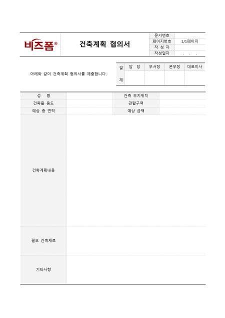 건축계획 협의서입니다. 성명, 건축부지위치, 건축물용도, 관할구역, 건축계획 내용 등으로 구성되어 있습니다.