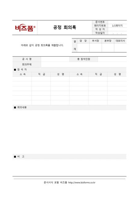 공정 회의록입니다. 공사명, 총 참석인원, 회의주제, 참석자, 회의내용, 비고 등으로 구성되어 있습니다.