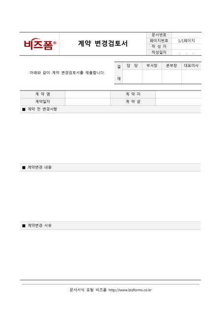 계약 변경검토서(계약명, 계약자, 계약일자, 계약금, 계약 전 변경사항, 계약변경 내용, 계약변경 사유)등으로 구성되어 있습니다.