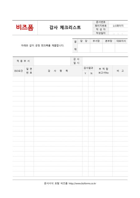 감사 체크리스트(간단양식) 입니다. 적용부서, 감사일시, ISO요건, 일련번호, 감사항목, 감사결과, 부적합보고서NO, 비고 등의 항목으로 구성되어 있습니다.
