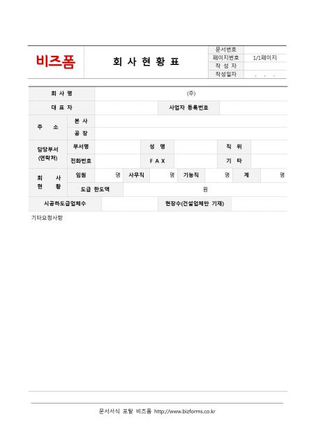 회사현황표(간단양식)입니다. 회사명, 대표자, 사업자 등록번호, 주소, 담당부서, 회사현황, 시공하도급업체수, 현장수 등의 항목으로 구성되어 있습니다.