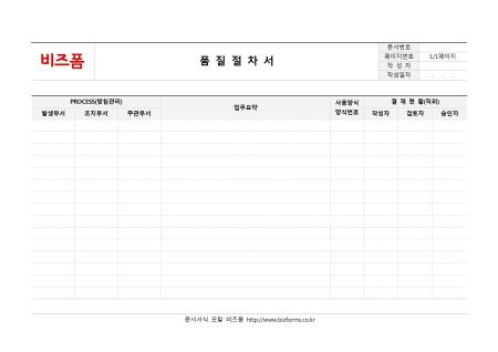 품질절차서(간단양식)입니다. 프로세스(발생부서, 조치부서, 주관부서), 업무요약, 사용양식 양식번호, 결재현황(작성자, 검토자, 승인자) 등의 항목으로 구성되어 있습니다.