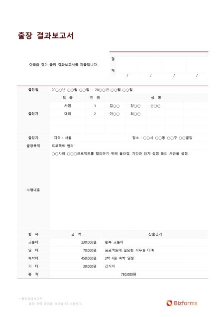 출장을 다녀온 후 결과에 대해 보고할 때 사용하는 서식이다. 구성요소는 출장일자, 출장자, 출장기간 등으로 구성되어 있으며 출장자는 귀임 2일 이내에 출장결과보고서를 작성하여 소정의 결재를 받아야 한다.