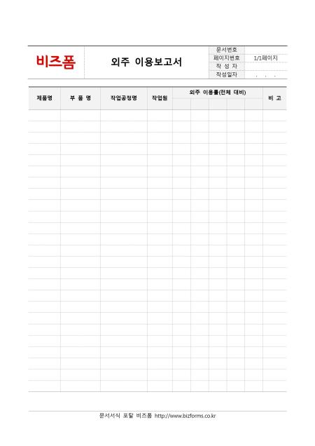 외주이용보고서입니다. 제품명, 부품명, 작업공정명, 작업원, 외주 이용률, 비고등의 항목으로 구성되어 있습니다.