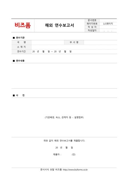 해외연수보고서입니다. 연수기관(국명, 부서명, 소재지, 연수기간), 연수내용, 사진(기관배경, 숙소, 관계자) 등의 항목으로 구성되어 있습니다.