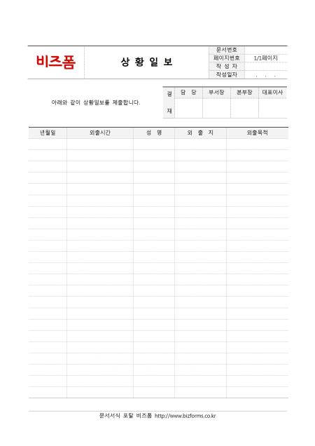 상황일보입니다. 년월일, 외출시간, 성명, 외출지, 외출목적 등의 항목으로 구성되어 있습니다.