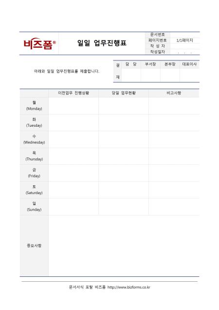 일일 업무진행표입니다. 일별로 나누어져 있으며 이전업무 진행상황, 당일 업무현황, 비고사항 등으로 구성되어 있습니다.
