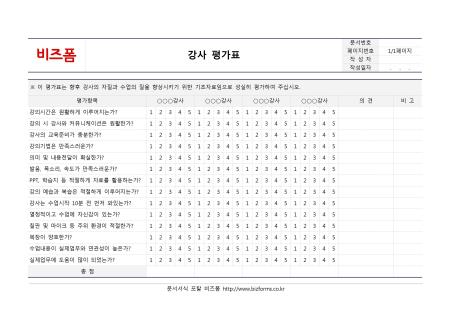 강사 평가표입니다. 평가항목, 강사명, 의견 등으로 구성되어 있습니다.