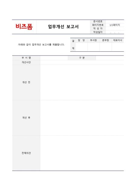 업무개선 보고서입니다. 업무개선 전, 후 내용 및 전체의견으로 구성되어 있습니다.