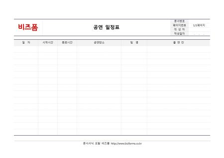 공연 일정표입니다. 일자, 시작시간, 종료시간, 공연장소, 팀명, 출연진 등을 작성하여 공연 일정을 관리할 수 있습니다.