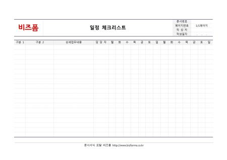 일정 체크리스트입니다. 프로젝트 업무일정관리 시 작성하는 문서로 상세업무내용, 담당자, 요일 등으로 구성되어 있습니다.