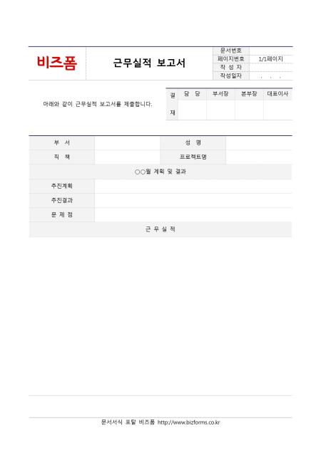 근무실적보고서 입니다. 개인 근무실적관리에 사용되고 있습니다.