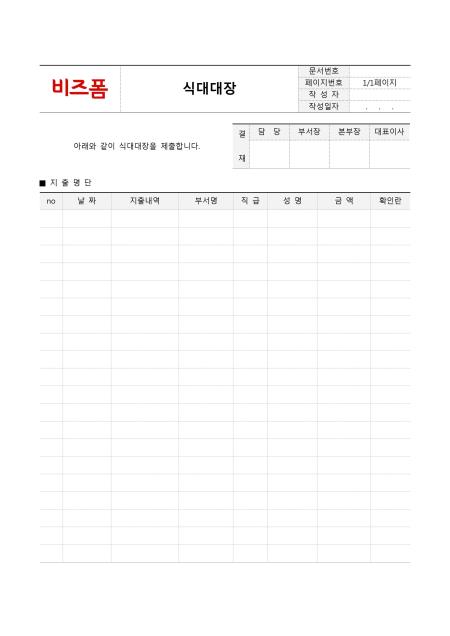 식대대장입니다. 작성자 인적사항, 지출 명단, 월 지출내역 등으로 구성되어 있으며, 월 식대비용이 얼마나 지출되었는지 작성할 경우 사용하면 좋습니다.