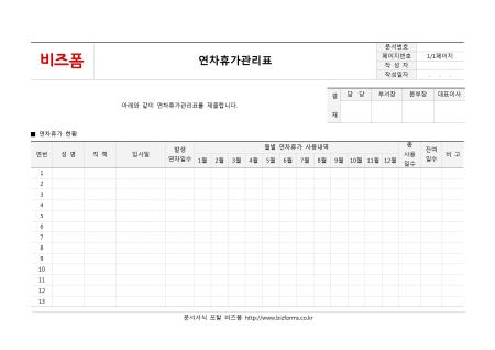 연차휴가관리표입니다. 사원 정보, 연차휴가 사용내역, 잔여일수 등으로 구성되어 있으며, 사원들의 연차휴가를 관리하거나, 월별 연차휴가 사용내역을 작성할 경우 사용하면 좋습니다.