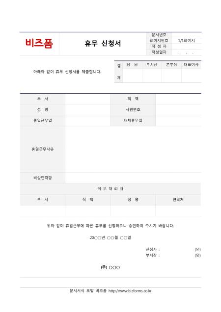 휴무신청서입니다. 부서, 직책, 성명, 사원번호, 휴일근무일, 대체휴무일, 휴일근무사유, 비상연락망, 직무대리자 등으로 구성되어 있습니다.