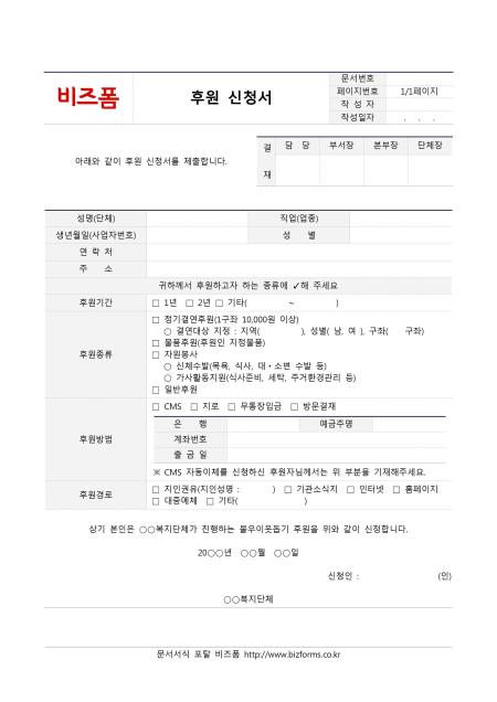 후원신청서입니다. 성명(단체), 직업(업종), 생년월일(사업자번호), 성별, 연락처, 주소, 후원기간, 후원종류, 후원방법, 후원경로 등으로 구성되어 있습니다.