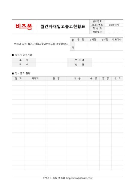 월간자재입고출고현황표입니다. 소속, 부서명, 직책, 성명, 입 · 출고 현황 등으로 구성되어 있으며, 월간 자재 입고와 출고 현황을 작성할 경우 사용하면 좋습니다.