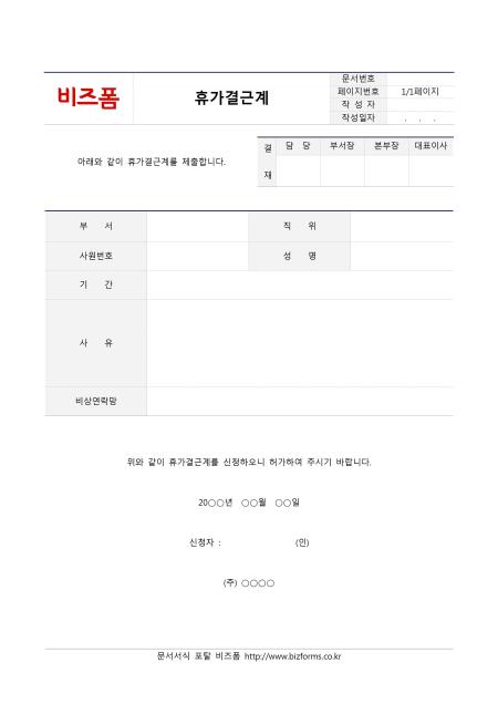 휴가결근계입니다. 부서, 직위, 사원번호, 성명, 기간, 사유, 비상연락망 등으로 구성되어 있으며, 휴가나 결근을 하고자 할 경우 사용하면 좋습니다.