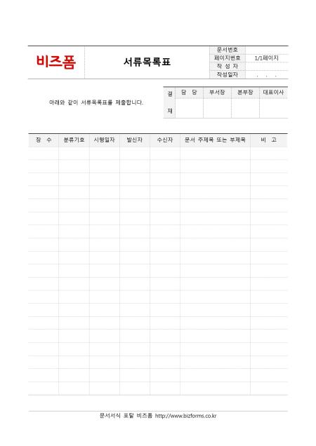 서류목록표입니다. 장수, 분류기호, 시행일자, 발신자, 수신자, 문서 제목 등으로 구성되어 있으며, 회사 서류 목록을 작성할 시 사용하면 좋습니다.