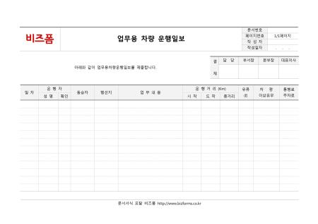 업무용차량운행일보입니다. 일자, 운행자, 동승자, 행선지, 업무내용, 운행거리, 유류 등으로 구성되어 있으며, 업무용 차량 운행 시 작성하면 좋습니다.