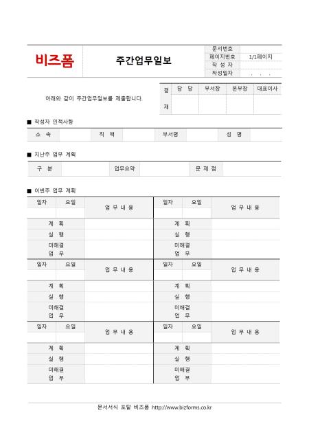 주간업무일보입니다. 작성자 인적사항, 지난주 업무계획, 이번주 업무계획 등으로 구성되어 있으며, 주간 업무 계획을 작성하기위하여 사용하면 좋습니다.
