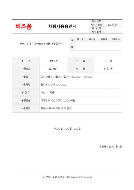 차량사용승인서 입니다. 부서, 직급, 사원번호, 성명, 사용일시, 사용차량, 행선지, 동행인원, 사용목적 등으로 구성되어 있습니다.