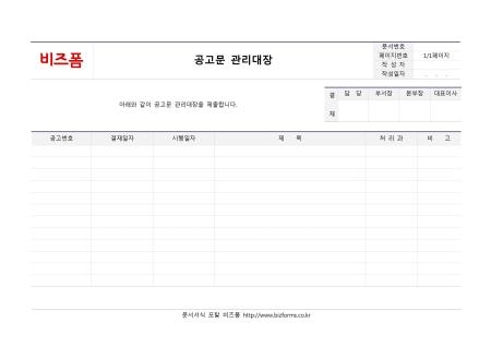 공고문 관리대장 입니다. 공고번호, 결재일자, 시행일자, 제목, 처리과, 비고 등으로 구성되어 있습니다.