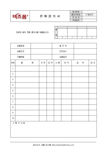 제품을 판매할 때 사용되는 서식이다. 구성요소는 납품업체, 납품조건, 인도장소등으로 구성되어 있으며 신용한도를 초과계약할 경우는 당해 부서에서 판매 품의서를 기안하고 업무부서에서 심사하여 영업부서장에게 신청하여야 한다.