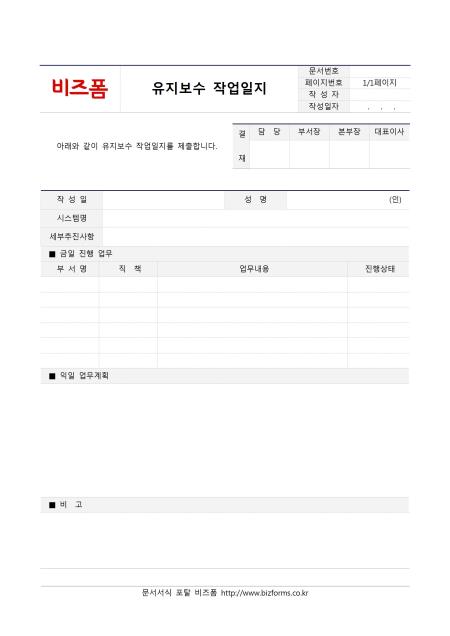 유지보수작업일지입니다. 작성일, 성명, 시스템명, 세부추진사항 등으로 구성되어 있습니다.