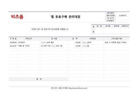 앱유료구매관리대장입니다. 구매일, 카테고리, 앱 이름, 금액, 구매 경로, 고객 불만사항 등으로 구성되어 있습니다.