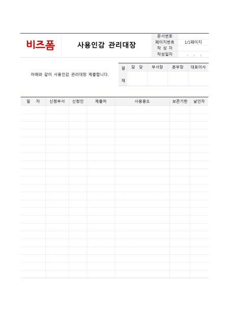사용인감관리대장 입니다. 일자, 신청부서, 신청인, 제출처, 사용용도, 보존기항, 날인자 등의 항목으로 구성되어 있습니다.