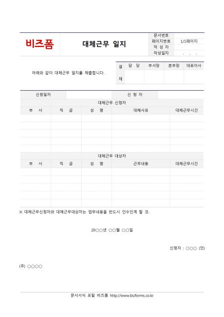 대체근무일지 입니다. 신청일자, 신청자 대체근무 신청자(부서, 직급, 성명, 대체사유, 대체근무시간), 대체근무 대상자(부서, 직급, 성명, 근무내용, 대체근무시간) 등의 항목으로 구성되어 있습니다.
