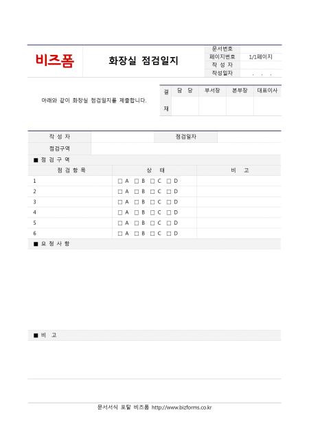 화장실 점검일지입니다. 작성자, 작성일자, 점검구역의 항목과, 상태, 요청사항 및 비고 등의 항목으로 구성되어 있습니다.