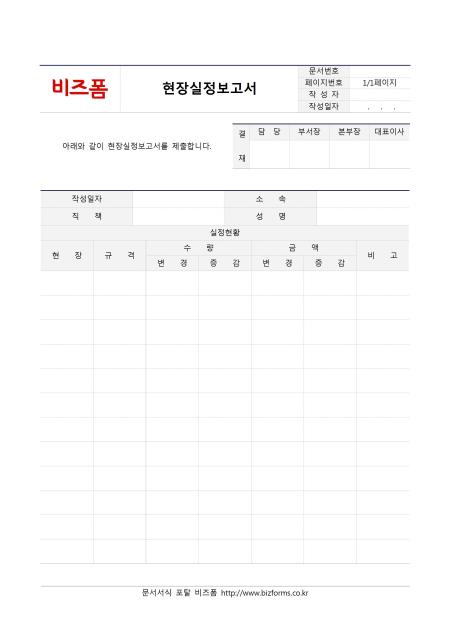 현장실정보고서입니다. 작성일자, 소속, 직책, 성명, 현장, 규격, 수량, 금액 등의 항목으로 구성되어있습니다.